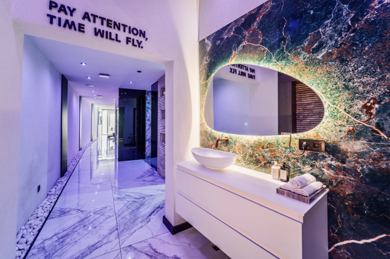 Privé Wellness bestaande uit alle 7-persoons Jacuzzi 99 jets, Finse design sauna (1/3 Benelux), Infraroodsauna met loungebed, Hammam met geurtherapie, Ice Bath, Rai...