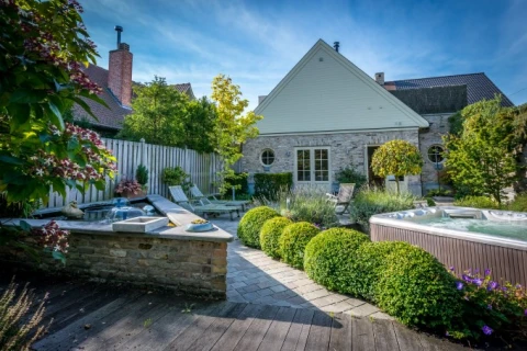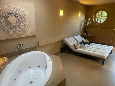 In de privé wellness kan je genieten van de sauna, een stoomcabine met eucalyptus, jacuzzi in een heel mooie en ruime tuin, een hydromassagebad binnen, een relaxruimte met minibar en warme en koude regendouches.