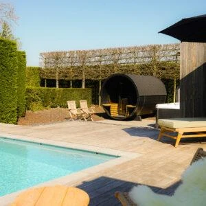 Wellness met jacuzzi, buitensauna, infraroodsauna & verwarmd zwembad. ( van begin april tot eind oktober )