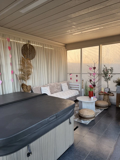 De jacuzzi staat onder een luxe overkapping, afgesloten met glazen schuifwanden. Bij slecht weer is deze altijd toegankelijk.